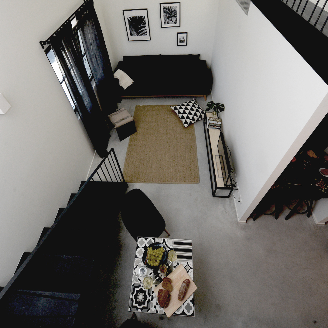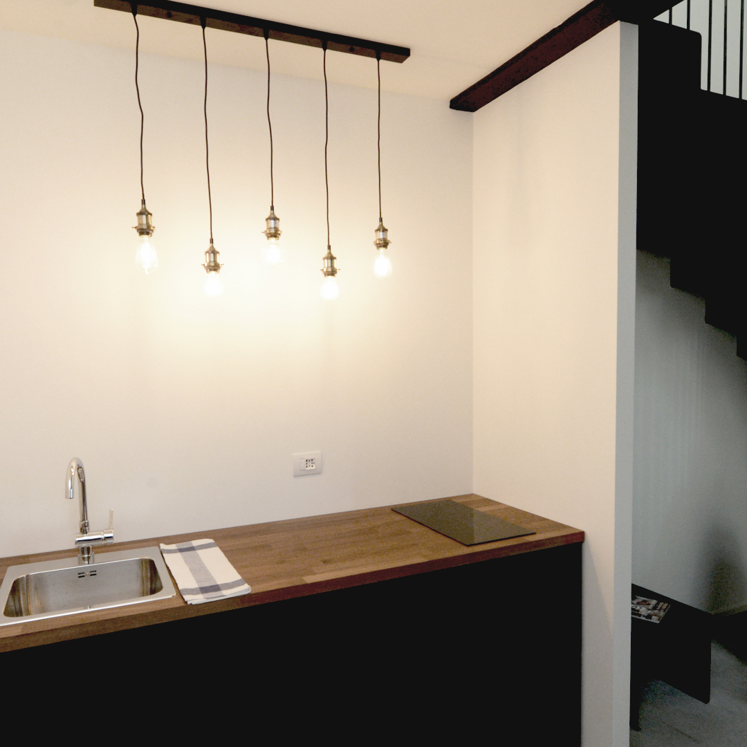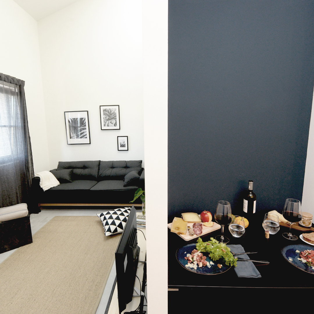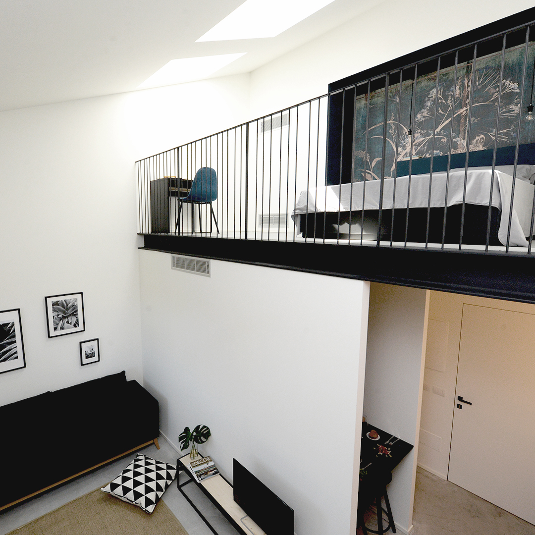38 mq su due livelli, ampia zona giorno dove la cucina e il soggiorno sono in relazione, il soggiorno è illuminato con finestra vista città, ha un carattere forte